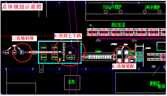 圖示“滑道”建議由步進保溫機統(tǒng)一考慮,傳輸帶上建議考慮支撐或者約束限定齒板位置以利下工序抓取。