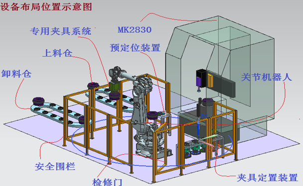 該系統(tǒng)自動(dòng)上下料系統(tǒng)為MK2830磨床服務(wù),由1臺(tái)6軸110KG機(jī)器人(機(jī)器人系統(tǒng))、上料倉、卸料倉、專用夾具系統(tǒng)、預(yù)定位裝置、安全防護(hù)系統(tǒng)和電器控制(本方案中未作示意)系統(tǒng)等組成。