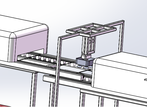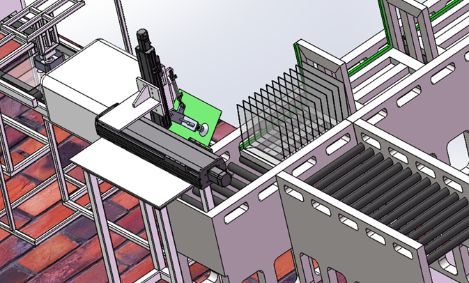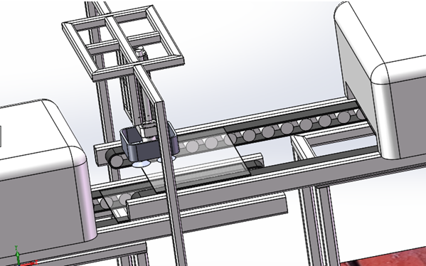 四軸上料機(jī)器人負(fù)載將堆放好毛玻璃通過X軸、Y軸、Z軸和R軸搬運(yùn)到寬邊磨邊機(jī)的傳送鏈上,由磨邊機(jī)進(jìn)行位置調(diào)整,調(diào)整完成后進(jìn)入寬邊加工件,對毛玻璃的4個面進(jìn)行加工。X軸集成在上料滾筒輸送鏈上,實(shí)現(xiàn)料倉的自動進(jìn)給和無間歇式換料。