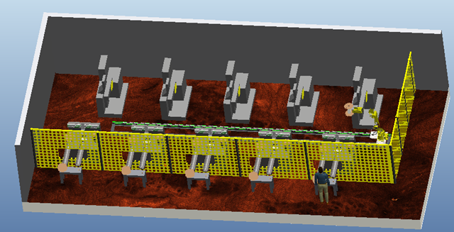 此系統(tǒng)由上卸料機(jī)器人、上卸料機(jī)構(gòu)、自定心裝置構(gòu)成。用于實現(xiàn)成組毛坯的分揀、成品成組疊放、成組毛坯及成品的輸送、單件毛坯及成品的搬運(yùn)及取放件機(jī)器人抓取工件之前對工件的自動定心。