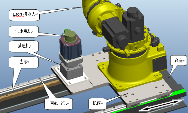 機(jī)器人七軸為機(jī)器行走機(jī)構(gòu),實現(xiàn)不同工位焊機(jī)之間的來回運(yùn)轉(zhuǎn)。此機(jī)構(gòu)采用伺服電機(jī)驅(qū)動,齒輪齒條傳動,直線導(dǎo)軌導(dǎo)向,底座采用型鋼焊接,分段制造、整體組裝。設(shè)計運(yùn)動速度42m/min。具體結(jié)構(gòu)見下圖。