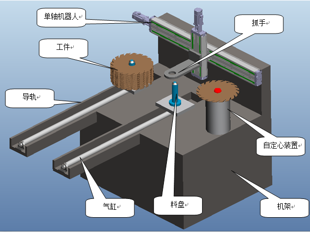 ? 自定心裝置的設(shè)計是為了給取放件機(jī)器人一準(zhǔn)確位置,方便在抓取之后準(zhǔn)確將工件裝載鋸片焊機(jī)上。