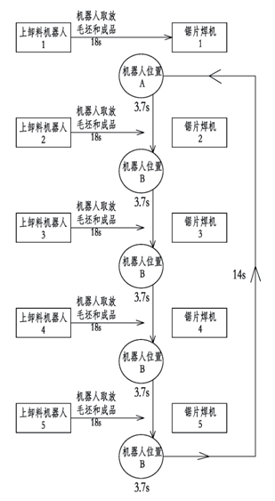 因為每臺焊機(jī)都有一個上卸料機(jī)器人,故只需要在焊機(jī)焊接時間2分鐘內(nèi)完成即可。具體節(jié)拍如下: