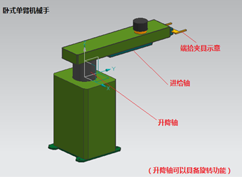 臥式單臂機(jī)械手主要由升降軸和進(jìn)給軸構(gòu)成,該裝備有升降軸擺動系列。動作穩(wěn)定可靠、執(zhí)行端配上專用端拾夾具實(shí)現(xiàn)壓機(jī)的上下料。