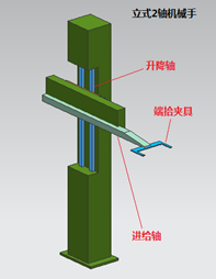 該立式機(jī)械手結(jié)構(gòu)簡單主要由升降軸和進(jìn)給軸兩部分組成,配合端拾夾具組合后實(shí)現(xiàn)上下料動作。