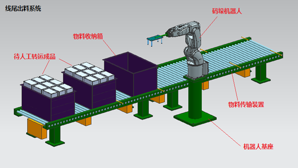 該系統(tǒng)示意參見下圖、主要由物料(收納箱)傳輸裝置、碼垛機(jī)器人系統(tǒng)、檢驗(yàn)平臺(圖中未示意)、物料收納箱構(gòu)成。