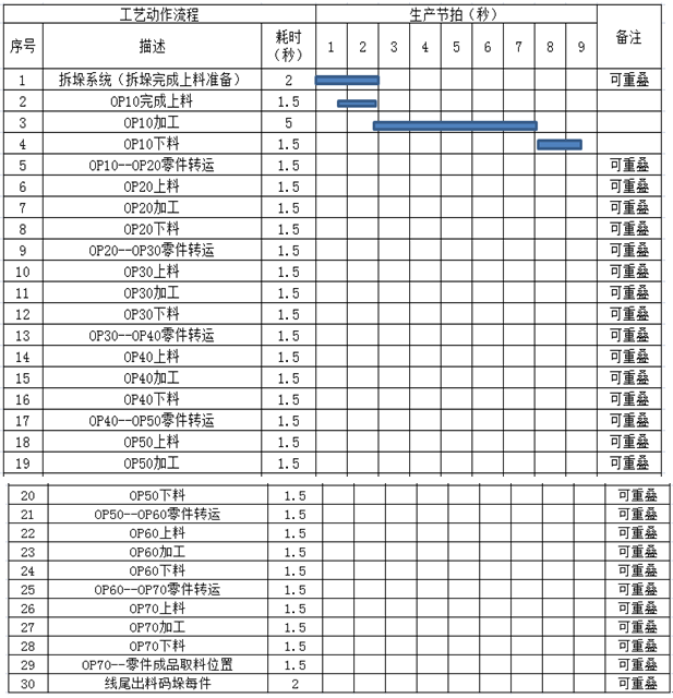 該沖壓線的節(jié)拍短板在OP10工序、其耗時(shí)在8秒左右。其余工序時(shí)間基本在5~6秒、均可重疊在OP10的時(shí)間區(qū)間內(nèi),因此OP10的總體用時(shí)直接決定生產(chǎn)線的產(chǎn)品出料節(jié)拍。