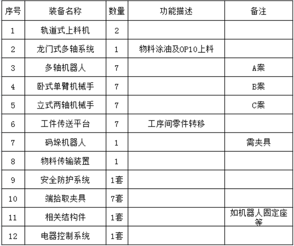 本方案中自動化傳輸系統(tǒng)包括為壓機(jī)上下料的裝備(根據(jù)該裝備的不同對方案給予細(xì)分)和工件傳送設(shè)備兩部分。