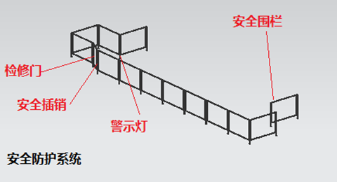 安全是開展生產(chǎn)活動的大前提、安全防護(hù)系統(tǒng)在自動化生產(chǎn)線中又顯的特別重要。該系統(tǒng)主要由完全圍欄、安全插銷、檢修門和警示燈等構(gòu)成。安全圍欄的范圍要考量到裝備的檢修和執(zhí)行端更換等空間位置。