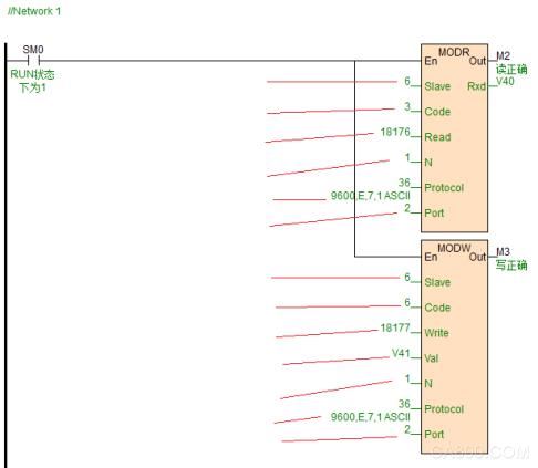 海為PLC通訊程序簡單,無論你使用何種通訊協(xié)議都只需一條通訊指令便可完成復雜的通訊功能,無須再為通訊端口沖突、發(fā)送接收控制、通訊中斷處理等問題煩惱。本例變頻器的波特率為9600,資料格式E,7,1,下面為讀取變頻器頻率通訊示例程序。