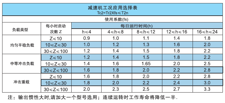 (4)  根據(jù)Tr2的值,和使用系數(shù)fs,計(jì)算在考慮實(shí)際使用狀況是的減速機(jī)扭矩:TC2,其中fs的選則見下表: