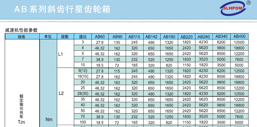 (5)    假設(shè)我們選擇:fs=1.3,則TC2= Tr2*1.3=114.6*1.3=149Nm;下一步查詢表格,要求選擇的減速機(jī)的額定輸出扭矩大于TC2這樣減速機(jī)就能滿足使用要求: