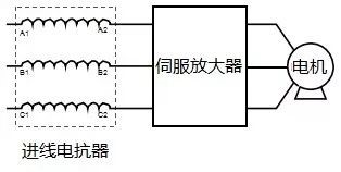 而電網(wǎng)電壓突變和操作過電壓引起的電流沖擊、諧波干擾、電壓中包含的尖峰脈沖等,對伺服放大器回路中的敏感元件損害很大。伺服放大器前加裝電抗器(稱為進線電抗器,line reactor),就能保護驅(qū)動裝置免受以上沖擊,如圖1所示。