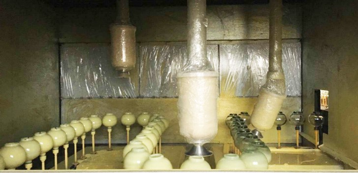 傳統(tǒng)噴涂是通過噴槍直接把油漆噴在玻璃瓶上,然后烘干,接著把多余的油漆通過水帶出車間,這樣既浪費(fèi)油漆,又嚴(yán)重的污染了環(huán)境。