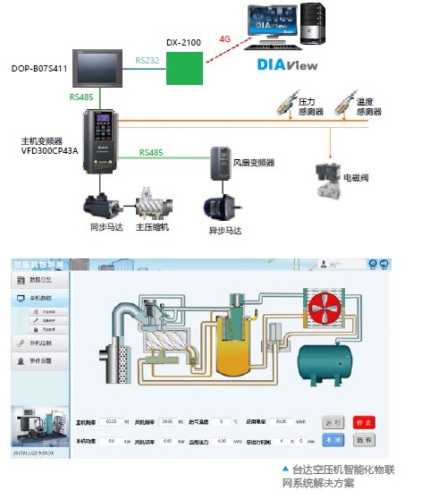 臺達(dá)解決方案整合了自有SCADA工業(yè)組態(tài)軟件DIAView系列、工業(yè)電腦、工業(yè)電源、4G無線模塊、人機(jī)界面、變頻器等。方案的創(chuàng)新在于實(shí)現(xiàn)了空壓機(jī)的智能化的控制,同時也可以將空壓機(jī)的控制信息納入工廠能源管理系統(tǒng)EMS的系統(tǒng)管控中。