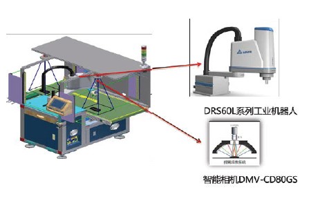 臺達(dá)解決方案包括SCARA工業(yè)機(jī)器人DRS60L系列、PLC、HMI、智能相機(jī)等,其中,SCARA工業(yè)機(jī)器人DRS60L系列主要用于追蹤點(diǎn)膠機(jī)并進(jìn)行點(diǎn)膠作業(yè)。由于機(jī)器人的靈活性,該解決方案還實(shí)現(xiàn)了快速換線且不需要夾具輔助即可完成作業(yè)的功能。