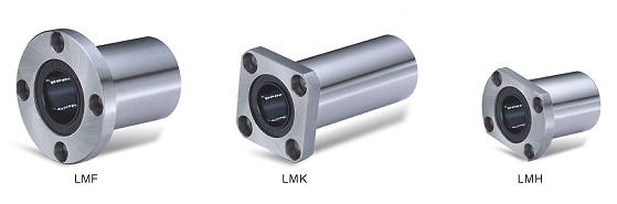 直線軸承的種類住了圓筒型以外,還有法蘭型產(chǎn)品。如圖4所示,法蘭型有三種規(guī)格,主要區(qū)別是法蘭的形式不一樣。LMF(圓法蘭),LMK(方法蘭),LMH(雙切邊法蘭)。對(duì)應(yīng)的也有加長型產(chǎn)品,增加后綴L即可。