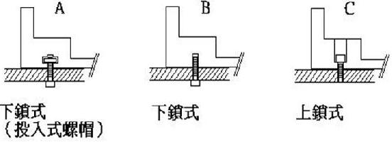 第一類是底座的安裝孔。底座安裝方式簡單區(qū)分有三種,如圖6:(A)底座開槽,用投入式螺帽由下方鎖固,這種方式歐洲產(chǎn)品較普遍;(B)底座攻牙孔,以螺絲由下方鎖固,(C)底座內(nèi)部鑚沉頭通孔,以螺絲由上方鎖固,這種鎖固方式通常必須將上方的護蓋拆掉才能工作,安裝完成后再將護蓋裝回。安裝前應先確認鎖固方式、螺絲間距、螺絲規(guī)格及長度等,并提供平整的安裝面及方向基準,確實鎖固。由于空間的限制,選擇單軸機械手臂的機型時,也必須考慮便利的施工作業(yè)空間。