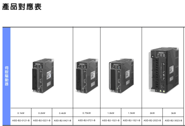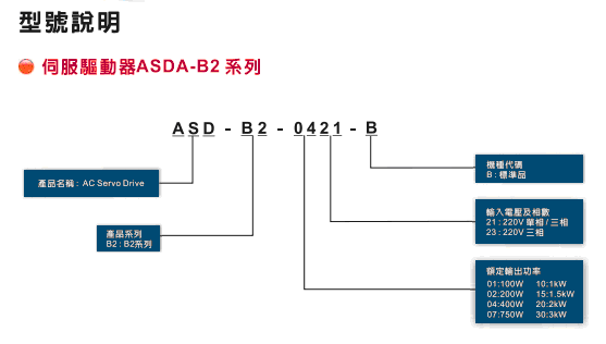 ASDA-B2系列功率數(shù)由0.1kW到3kW,其優(yōu)越的性能特點強調(diào)於「內(nèi)建泛用機能應(yīng)用,減少機電整合之變異成本」。使用臺達ASDA-B2系列產(chǎn)品時,除了可便利完成配線和操作設(shè)定,在與他牌產(chǎn)品更換過程中,馬達尺寸的對應(yīng)性和產(chǎn)品特性的匹配,皆在水準之上。ASDA-B2系列不僅滿足市場對於泛用產(chǎn)機的國產(chǎn)化設(shè)備需求,並且針對專用機提供多樣化的操作選擇。