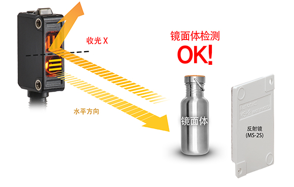 鏡面反射型具有M.S.R. (鏡面抑制)功能,使得傳感器只接收來自特定反射鏡(MS-2S)的光線。 該功能可以穩(wěn)定檢測高反射目標,包括金屬,鏡子等。