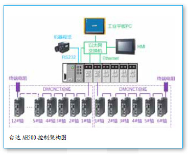 ■DMCNET總線控制:1個AH20MC模塊可帶12軸,18軸用2個AH20MC模塊,采用“12軸+6軸”的組合方式。該總線方案較其它品牌的脈沖型控制方案,具有省配線、控制速度快(通訊速率可達10Mbps)、可靠性高的優(yōu)點。