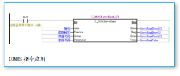 DMCNET通訊初始化,通過DMCControllnit功能塊來實現(xiàn),用于設置各個伺服的電子齒輪比和將AH20MC與伺服作控制狀態(tài)對應,開機后只要操作一次即可,也是后續(xù)所有操作的第一步。初始化完成后,伺服默認處于ServoOn的狀態(tài)。