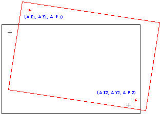 由于材料本體尺寸比較大,如果將被測(cè)物完全拍攝到,則其檢測(cè)精度必然無(wú)法達(dá)到要求。所以考慮只拍攝該板材上的上下兩個(gè)MARK(標(biāo)記)的位置,獲知兩個(gè)MARK點(diǎn)的偏移量后可通過(guò)推導(dǎo)得出該板材的整體偏移量以及旋轉(zhuǎn)角度。